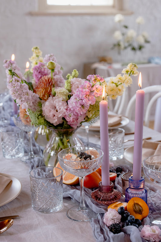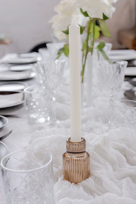 Our dinner candles are the perfect addition for florist décor & styling and table styling decor at any wedding or event. Available in various colours, these 25cm candles come in packs of 4, fitting seamlessly into any theme and enhancing the ambiance. They pair perfectly with our Reversible Candle Holders, adding elegance and sophistication to your tablescapes. Our dinner candles ensure a memorable and stylish setting.